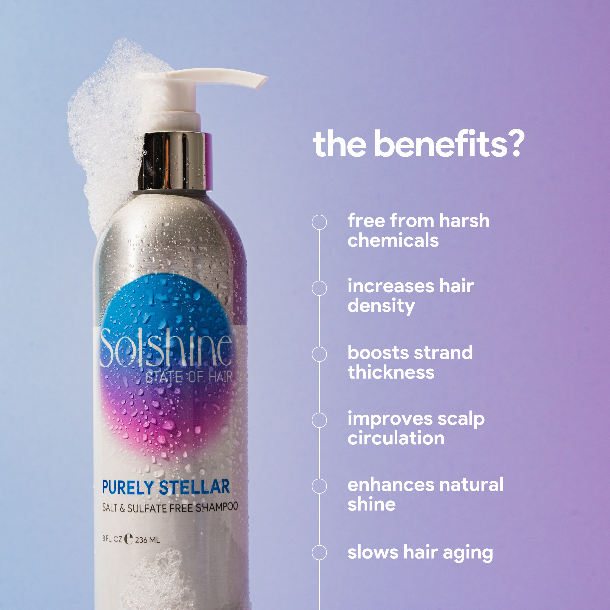 Get ready for out-of-this-world clean with Purely Stellar Salt & Sulfate Free Shampoo! This gentle formula is free of the usual hair villains—sodium chloride, sulfates and harsh chemicals—but packed with scalp-loving ingredients that boost circulation and strengthen your strands. Daily use helps slow down hair’s aging process by delivering a keratin shield that steps up to face the elements, protecting your natural shine. It’s like wrapping your hair in its own forcefield, keeping your locks healthy, vibrant, and gravity-defyingly gorgeous. This is hair care that’s light years ahead!