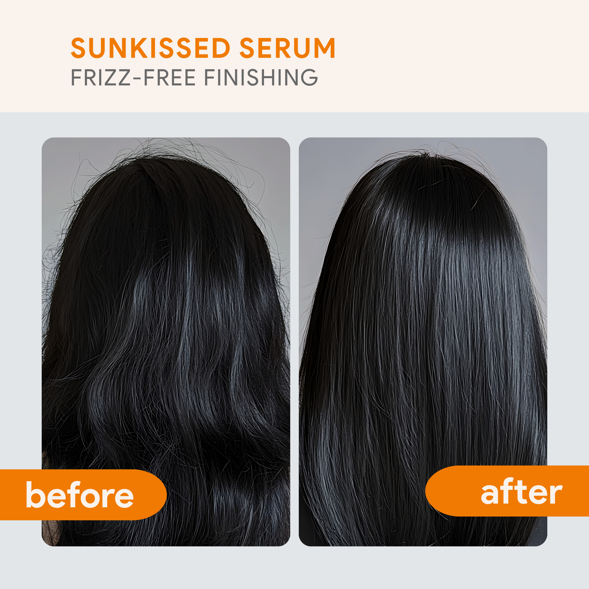Sunkissed Serum dives deep into your strands, building strength from the inside out by forming new bonds that reinforce your hair’s natural keratin. This serum doesn’t just condition and repair—it gives your cuticle a protective barrier, adding sunkissed shine and fending off the frizz and weathering damage. Whether it’s a sunny day or stormy skies, your hair will stay sleek, strong, and shine brighter than the forecast!